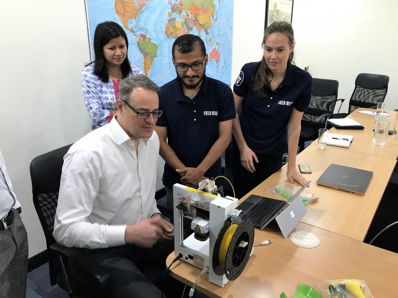 UNRCPD welcomed Field Ready Nepal into the office to receive a series of presentations and demonstrations of current and emerging 3-D technologies. The presentations were delivered by Field Ready staff Ben Britton, Ram Chandra Thapa, Kieran Ram and Marjolein van der Male and focused on 3-D printing related to: