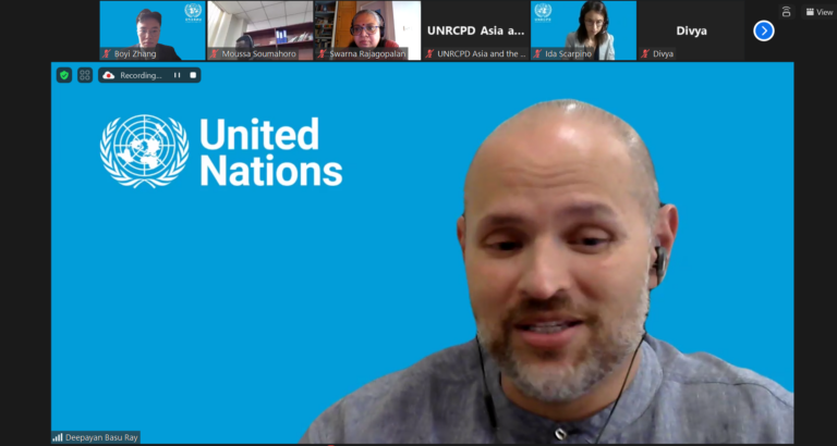 As the first speaker of the day, Mr. Boyi Zhang, Junior Project Advisor for Youth and Disarmament at UNRCPD, introduced the Secretary General’s Disarmament Agenda and Our Common Agenda, and provided participants with an introduction to the broad disarmament framework, and the work of the United Nations in promoting sustainable peace through disarmament, non-proliferation and arms control.