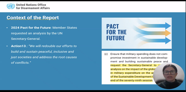 The event opened with a recorded briefing laying down the foundational context of the Secretary-General's report. The report was developed in response to Action 13(c) of the Pact for the Future, which requested the analysis of the impact of rising global military expenditure on the achievement of SDGs.