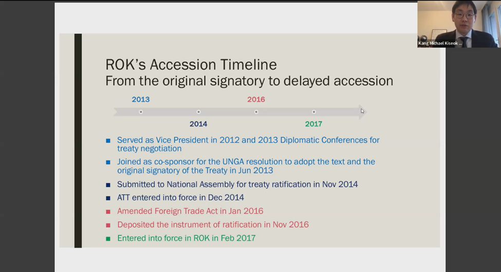 As the discussion continued, participants heard ATT experiences directly from involved states in the Asia-Pacific, including state parties such as the Republic of Korea (ROK) and the Philippines as well as signatories such as Cambodia. [IS1] Mr. Kang Michael Kiseok, First Secretary of the ROK’s Permanent Mission to the UN in Geneva, gave a presentation highlighting the advantages of inter-agency cooperation ATT membership had brought, alongside advantages for the ROK’s domestic arms industry from enhanced export controls. Atty. Pierre Kalaw, Assistant Legal and International Affairs for the Office of the Special Envoy on Transnational Crime, Office of the President, the Philippines, emphased the strengths of the treaty’s international arms control cooperation and close synthesis with national development initiatives. Finally, Mr. Por Thao, Deputy Director of the Department of Planning within the General Department of Materials and Techniques, Cambodian Ministry of Defence, highlighted the tangible advances in combatting arms diversion to criminal and armed groups following Cambodia’s ATT membership, leading to increased foreign direct investment from enhanced stability. All three representatives also spoke of the actions needed to solve the ATT’s universalization challenges, including streamlined inter-agency cooperation, effective risk assessment criteria integrated into transfer and export/ import processes and enhanced public awareness.