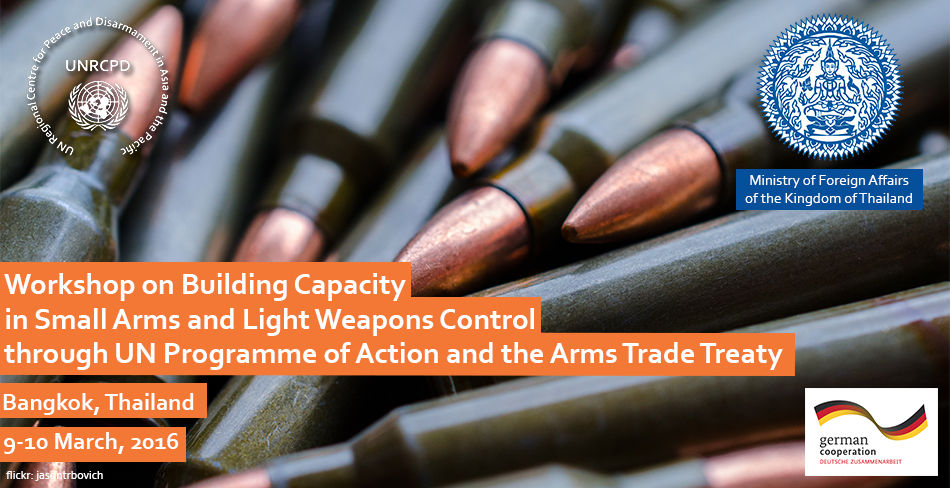 As many as 32 representatives from 22 national agencies and departments involved in small arms and light weapons (SALW) control in Thailand met with international experts on 9-10 March 2016 in Bangkok to learn more about and discuss the implementation requirements of the United Nations Programme of Action to Prevent, Combat and Eradicate the Illicit Trade in Small Arms and Light Weapons in All Its Aspects (PoA) and the Arms Trade Treaty (ATT). This workshop was organized by UNRCPD, in cooperation with the Government of Thailand, and made possible with financial support from the Government of Germany.