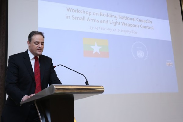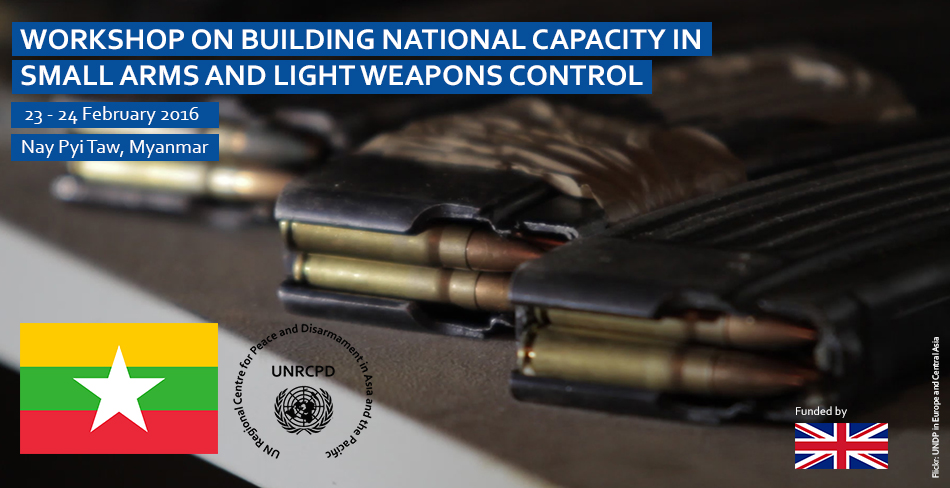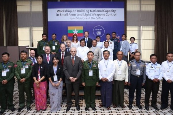 UNRCPD, in cooperation with the Government of Myanmar, organized a capacity-building workshop on small arms and light weapons (SALW) in Nay Pyi Taw, 23-24 February 2016. The purpose of the workshop was to assist relevant Government ministries and agencies in enhancing national control of SALW in Myanmar and thereby the ability to further implement the provisions of the UN Programme of Action on the Illicit Trade in Small Arms and Light Weapons and other international treaties and instruments relevant for the control of these arms. This workshop was funded by the United Kingdom of Great Britain and Northern Ireland.