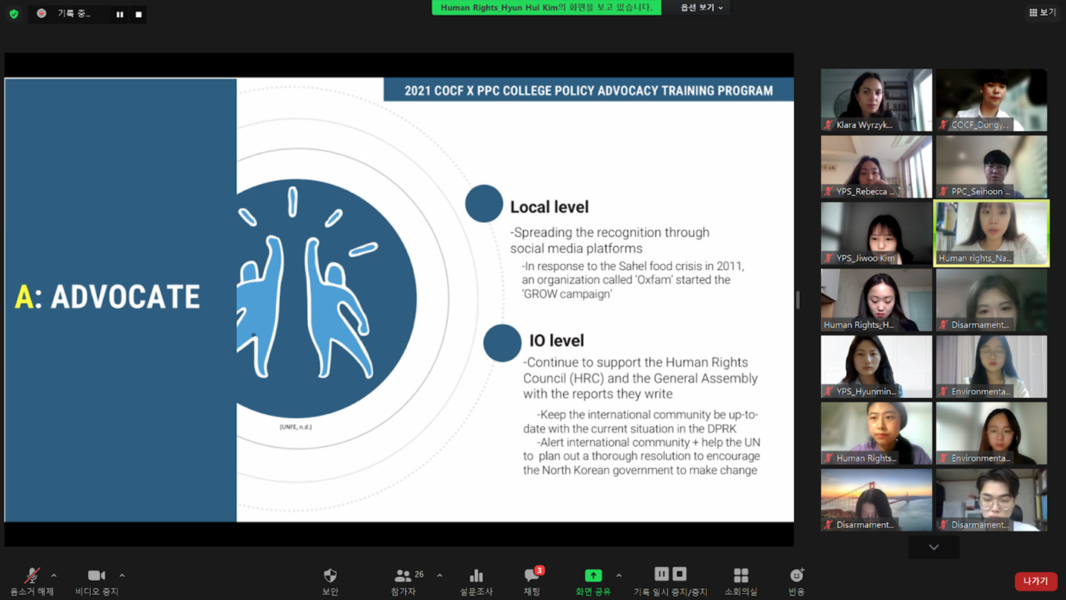 After a competitive selection process, PPC and COCF selected fifteen university leaders in South Korea and divided them into five different groups based on areas of interests: human rights, disarmament, peace, environmental justice, and climate change. Throughout the six-week-long program, PPC board members and staff provided weekly mentoring sessions and feedback on the students’ policy research. Although there was a large learning curve to fully comprehending each policy area, the participants awed us with their tireless passion for accurate research and creative insights every step of the way.