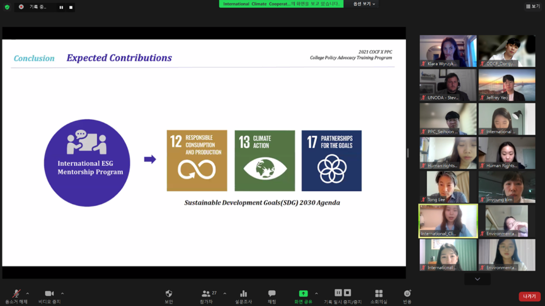 Since the beginning of this year, we have prepared a policy advocacy training program for South Korean youth as a solution of bridging this large gap between policymakers and young people. After successfully completing a pilot program with high school leaders, we organized a six-week-long, intensive capacity training program titled “ROK University Students Policy Advocacy Training Program” in partnership with the Coalition for Our Common Future (COCF), a UN Department of Global Communications (UNDGC) and UN Framework Convention on Climate Change (UNFCC) associated NGO based in Seoul.